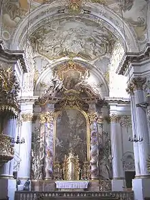 L'église a été gravement endommagée par les bombardements alliés de l'automne 1944, et l'intérieur a brûlé. Aussi est-il décidé de restaurer les somptueuses peintures murales des frères Asam en couleur sépia, car il ne restait plus que des photographies en noir et blanc pour reconstituer le décor. La peinture murale de l'Agneau de l'Apocalypse se trouve sous la coupole, le Concert des anges dans le chœur et celle de l'Hommage de l'ange, près de l'entrée.