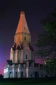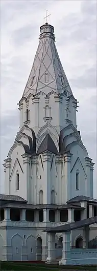 Louis Réau voit dans l'Ascension de Kolomenskoie l'imitation manifeste d'un modèle en bois auquel elle emprunte toutes ses formes podklet, kokochniks, chatior :