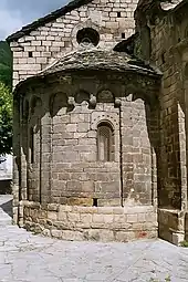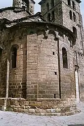 L'abside et son absidiole, édifiées en pierre de taille comme l'ensemble de l'édifice, présentent une décoration de bandes lombardes composées de lésènes et d'arcatures.