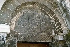 Le tympan en marbre gris, porté par un linteau orné d'un chrisme et d'une frise en damier, représente le Christ en gloire entouré par le tétramorphe, constitué par le symbole des quatre évangélistes.