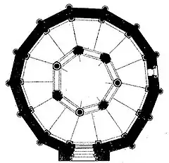 L'église a été construite suivant un plan centré de rotonde de 7 côtés dans sa partie centrale couverte d'une coupole à sept pans, entouré d'un déambulatoire de 14 côtés. La poussée de la coupole est contre-butée par une voûte en quart de cercle qui couvre le déambulatoire.