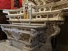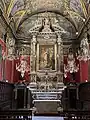 Le retable du maître-autel date de 1624[3]. Les incrustations de marbre polychrome, les colonnes imposantes et les trois statues nous indiquent la grande qualité et le coût important de l’œuvre[3].