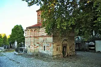 Elle s'inscrit dans un plan tréflé allongé, dans une variante en forme de croix[1] ; à l'extérieur, les branches de la croix prennent une forme pentagonale[2]. À l'intersection de ces branches se trouve une coupole reposant sur un tambour appuyé sur des colonnettes angulaires[1]. Horizontalement, les façades sont rythmées par un socle et par un cordon ainsi que par une corniche en briques ; sur les deux côtés, le ruban décoratif est surmonté par des arcades aveugles, tandis qu'au-dessus du soubassement, on peut voir des ouvertures, l'une en forme d'oculus, une fenêtre simple et une autre géminée[1]. L'église est bâtie avec des blocs de pierres en alternance avec trois couches de briques[1].