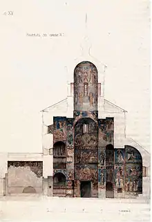 À l'époque de la guerre d'Ingrie avec les Suédois (1614—1617) l'église est endommagé, mais ni les murs ni les fresques n'ont à souffrir des combats. En 1825 une partie de l'édifice est détruite par la foudre. Les fresques sont disposées suivant l'ordonnancement habituel : dans la coupole et les tambours le Christ Pantocrator les archanges et les prophètes. Dans l'abside la Vierge Marie et les Apôtres. Les proportions des personnages sont très allongées[3].