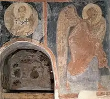 Sur la voûte de l'abside, on trouve l'image de la Vierge entourée de deux anges. C'est une image de type Orante mais avec l'enfant Jésus sur ses genoux. Une petite composition est située au nord de la partie réservée à l'autel, au Jertvennik. Certaines figures sont bien conservées : celles de Basile de Césarée et de Jean Chrysostome et l'ange-diacre avec Ripidion.