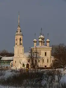 L'église est construite à partir de 1731. Son architecture témoigne de la fusion du motif russe traditionnel du XVIIe siècle avec le style baroque arrivé tardivement à Vologda. La partie principale de l'édifice est un cube fortement allongé en hauteur, couronné de cinq dômes sur de minces tambours, avec une trapeznaïa (littéralement : réfectoire, église chauffée) et un clocher et un porche relié à celui-ci depuis la partie Ouest. Les façades sont ornées d'une large corniche à briques façonnées en forme de consoles. Le même motif est repris sur les tambours des coupoles, sur la façade de l'église-réfectoire et sur le clocher à trois niveaux. Les angles de l'édifice sont ornés de pilastres jumelés. Sous les corniches, sur les pilastres, les plateaux et les frontons, il y a des inserts de tuiles figurées et émaillées, ce qui est un détail unique pour les églises de Vologda de cette époque[3]. Remarquables sont les chambranles richement ornées des fenêtres, combinant les motifs russes avec de nouvelles formes qui sont entrées dans l'architecture russe à l'époque de Pierre le Grand (« frontons brisés »).