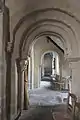 Les arcades à colonnettes engagées reliant les croisillons au chevet présentent la même inspiration originale dans le dessin de la face interne des arcs de plein cintre qui présentent une multiplication de tores parallèles[3].