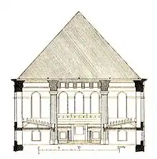 L'intérieur de l'église est caractérisé par une abside avec de hautes baies vitrées, un maître-autel, une chaire et une rangée monumentale de colonnes qui portent la voûte d'ogives de la nef. Dans les bas-côtés, il y a des loges, au-dessus desquelles des galeries latérales sont aménagées[2]. Le premier bâtiment ne comporte pas d'orgue.