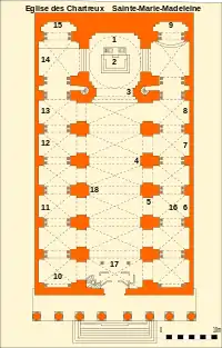Légende du plan: 1- La Madeleine enlevée par les anges, tableau de Michel Serre, 2- Maître-autel, 3- Christ en croix, sculpture de Chauvel, 4- Chaire, 5- Tombeau de Dom Joseph Martinet, 6- Statue de sainte Thérèse de l'Enfant Jésus par Alfred Lang 7- Statue de saint Antoine de Padoue par louis Botinelly, 8- Statue de saint Bruno par Louis Botinelly, 9- Statue de sainte Marie Madeleine par Louis Botinelly, 10- Fonts baptismaux, 11- Statue de la Vierge à l'Enfant dite Notre-Dame du Rosaire, 12- Statue de saint Joseph et l'Enfant Jésus par Alfred Lang, 13- Pietà sculpture d'Elie Jean Vézien, 14- Bas-relief de l'Annonciation par Barat, 15- Statue de Notre-Dame de Lourdes par Elie Jean Vézien, 16- Vitraux,- 17- Orgue,- 18- Appliques lumineuses.