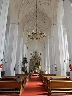 Après 1958, l'église a été autorisée à être reconstruite sous une forme qui ne reflète pas l'histoire calviniste de l'église, notamment en termes de plan de l'église, mais qui est appropriée pour le culte catholique. Il y a un maître-autel baroque dans le choeur, qui n'est pas original dans la décoration intérieure de l'église. 60 % des détails authentiques de cet autel seront installés, dont une peinture baroque de l'Immaculée Conception de la Bienheureuse Vierge Marie. Dans le bas-côté nord se trouve une stalle Renaissance du XVIIe siècle. À l'intérieur de l'église se trouvent des éléments de sculpture sur bois baroque. Il était prévu de recréer la galerie de musique dans le bas-côté sud, en utilisant certaines boiseries authentiques. Au bout du bas-côté nord se trouvent des fonts baptismaux gothiques conservés du XVe siècle.