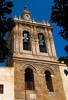 La tour de l'église s'élève sur ce qui était le minaret de la mosquée, de section rectangulaire. La base de la tour est de l'époque musulmane et son couronnement date du XVIIIe siècle. On y monte en entrant par le patio, en traversant l'appartement du sonneur, par des escaliers encastrés dans la pierre. Son aspect actuel date des modifications effectuées entre 1718 et 1719, notamment par Leonardo de Figueroa[1].