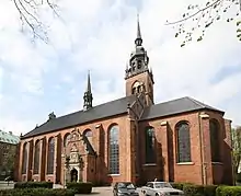 L'église du Saint-Esprit devient une église paroissiale luthérienne en 1537 et le clocher, dont les travaux avaient été arrêtés, est terminé en 1582 à l'initiative du gouverneur de la ville Christoffer Valkendorff (de). Une flèche est ajoutée en 1594.
