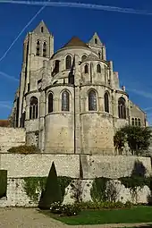 Le caractère roman du massif occidental n'a jamais fait de doute. C'est par sa construction que le projet de reconstruction de la fin du XIe siècle est relancé, ou plutôt rendu caduque, vers 1130 / 1140 selon Delphine Hanquiez à la lumière de ses recherches approfondies[27]. Selon l'hypothèse émise par Eugène Lefèvre-Pontalis[18], la nouvelle façade et l'avant-nef avec la tour méridionale servent à l'ancienne nef dans un premier temps, mais les fouilles en 1955 ont révélé que celle-ci ne commence que trois travées plus loin à l'est[28], soit 13 m environ[29]. Par ailleurs, l'on suppose aujourd'hui que la tour manquante au nord de la façade (à gauche) n'a jamais existé. — Une fois le massif occidental achevé dans cet état incomplet, le projet est reconsidéré. C'est du côté opposé que le chantier reprend, peut-être dès les années 1140, avec les travaux de terrassement et la construction du soubassement de la nouvelle abside avec ses chapelles rayonnantes. En effet, des marques de tâcheron similaires permettent la conclusion que des artisans déjà engagés pour l'érection du massif occidental restent à l'œuvre sur le chantier du sanctuaire. La progression se fait par tranches horizontales. Une fois les voûtes des chapelles rayonnantes terminées (années 1160), l'on s'attaque aux piliers du rond-point de l'abside, aux voûtes du déambulatoire (années 1170), puis aux deux premiers niveaux des travées droites du chœur (années 1170-1180). Les concernant, les grandes arcades et les murs gouttereaux des bas-côtés sont entrepris simultanément. Ce n'est qu'à partir de leur achèvement que débute le montage de l'étage des fenêtres hautes, toujours en commençant par le chevet. Au moment de la construction de ce troisième niveau d'élévation à l'ouest du chœur, à la fin du XIIe siècle, les piliers à la fin de la nef sont déjà debout. Le mur gouttereau du bas-côté nord est bâti à trois mètres de hauteur jusqu'au massif occidental, tandis que le mur gouttereau du bas-côté sud n'est bâti que sur un mètre et demi de hauteur, et s'arrête à la quatrième travée[30].