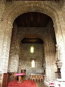 Certains éléments architecturaux témoignent encore de l'antiquité de la bâtisse: appareillage de petits moellons, fenêtres en meurtrières dispensant un éclairage parcimonieux, contreforts plats, voûte maçonnée du chœur, absence de décor sculpté. Pour autant, le sanctuaire constitue un espace privilégié: il se distingue par la qualité supérieure de sa stéréotomie et l'arcature qui anime sa paroi intérieure. Le clocher à l'impériale et les annexes (XIXe siècle) entourant le bras sud du transept et faisant office de sacristies alourdissent quelque peu la silhouette de l'édifice.