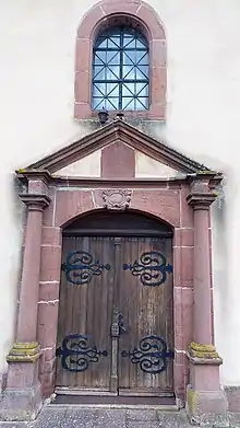 La nef est une construction assez simple seulement couverte d’un plafond, sans voûtes. Le mur occidental est percé d’un portail néoclassique à deux colonnes supportant un fronton. Celui-ci porte l’inscription « Hans Jorg Keyser der Zeit Schultheis HB. MH. HB. DW. PMP. IK. », qui est peut-être la signature du commanditaire et de l’équipe chargée du chantier, tandis que le millésime 1739 se trouve sur le linteau[3].