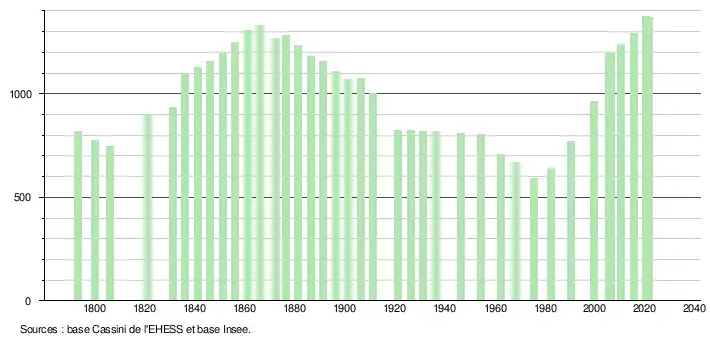 L'évolution du nombre d'habitants est connue à travers les recensements de la population effectués dans la commune depuis 1793. Pour les communes de moins de 10 000 habitants, une enquête de recensement portant sur toute la population est réalisée tous les cinq ans, les populations légales des années intermédiaires étant quant à elles estimées par interpolation ou extrapolation[15]. Pour la commune, le premier recensement exhaustif entrant dans le cadre du nouveau dispositif a été réalisé en 2005[16].