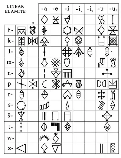 L'élamite linéaire est un système qui est peut-être dérivé du proto-élamite et fut utilisé avec certitude vers la fin du IIIe millénaire av. J.-C., bien qu'il ait pu être mis au point plus tôt. Son déchiffrement a été annoncé en 2020[6], bien que le déchiffrement ait été débuté en 2017 par le chercheur François Desset et son équipe[5]. Ce système d'écriture phonétique se base sur 77 signes, ce qui en fait l'unique syllabaire connu du troisième millénaire av. J.-C., bien avant le syllabaire minoen utilisé 800 ans plus tard[5],[1].