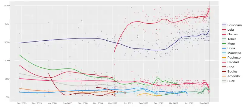 L'ancien président Luiz Inácio Lula da Silva (2003-2011), emprisonné pendant deux ans pour des allégations de corruption lors de l'opération Lava Jato par le juge (et candidat) Sergio Moro, n'a pas pu se présenter aux élections de 2018. En 2021, la Cour suprême revient sur son emprisonnement, jugeant la condamnation de Moro « partiale »[27]. Il reste en tête des intentions de vote du fait d'une forte popularité auprès des classes populaires. Son rapprochement avec le centre droit laisse penser que son éventuel retour au pouvoir ne conduira pas à une politique marquée à gauche, bien qu'il se soit prononcé en faveur de hausses d’impôts pour les plus riches[24]. Son programme propose également de relancer un nouveau programme social Bolsa Família : en plus des 600 reais versés par le programme « Auxilio Familia » instauré par Bolsonaro, s'ajouterait le versement de 150 reais pour chaque enfant de moins de six ans dans les familles brésiliennes[23].