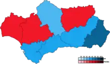 Le taux de participation recule à 60 %, mais la forte abstention semble cette fois-ci favoriser la gauche, alors qu'elle lui était traditionnellement défavorable[38], le PP échouant à mobiliser ses électeurs. Là où le PSOE-A obtient globalement le même nombre de voix qu'aux élections générales, le PP perd près de 450 000 suffrages. Progressant de 110 000 voix par rapport aux dernières régionales, la Gauche unie (IULV-CA) double sa représentation, faisant élire au moins un député dans chaque circonscription[37].