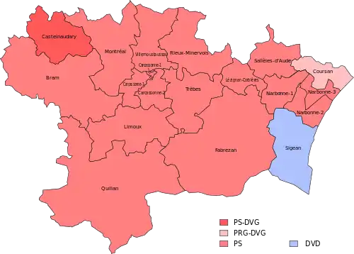 1- Bram, 2- Carcassonne-1, 3- Carcassonne-2, 4- Carcassonne-3, 5- Castelnaudary, 6- Coursan, 7- Fabrezan, 8- Lézignan-Corbières, 9- Limoux, 10- Montréal, 11- Narbonne-1, 12- Narbonne-2, 13- Narbonne-3, 14- Quillan, 15- Rieux-Minervois, 16- Sallèles-d'Aude, 17- Sigean, 18- Trèbes, 19- Villemoustaussou