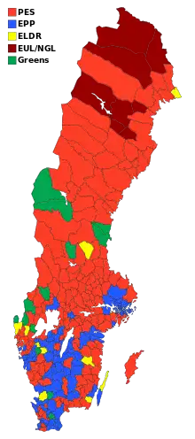 Les sociaux- démocrates ont réalisé un faible score, ne réunissant que 28 % des voix, même si le parti est resté le premier des partis suédois. Les Verts et la gauche sont les deux partis ayant le plus bénéficié de l'issue de ces élections. Les deux partis ont accru leur score par rapport à la délégation de députés européens désigné par le Parlement, pour la période allant du 1er janvier au lendemain des élections. Les Verts ont progressé de trois sièges et la Gauche de deux. Les Chrétiens-démocrates n'ont pas réussi à franchir le seuil nécessaire pour entrer au parlement européen. Pour les autres partis, ces élections n'ont pas modifié le nombre de sièges octroyés par le parlement. Le taux de participation a atteint un record de par sa faiblesse, avec seulement 41,63 %.
