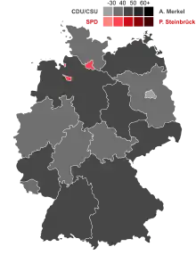 Leur partenaire au sein de la grande coalition au pouvoir, le Parti social-démocrate d'Allemagne (SPD) avait, pour sa part, lourdement chuté, jusqu'à 23 % des voix, son plus mauvais score depuis 1949 et la création de l'Allemagne fédérale. Le président du parti, Franz Müntefering, avait alors remis sa démission, laissant le candidat à la chancellerie, Frank-Walter Steinmeier, prendre la direction de l'opposition, en attendant l'élection de Sigmar Gabriel à la tête du parti.