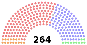 | Total sièges : | 23 | 19 | 13 | 13 | 88 | 74 | 10 | 11 | 4 | 7 | 1 | 1 | 264 | ||