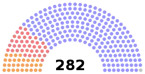 | Total sièges : | 28 | 21 | 14 | 14 | 95 | 75 | 10 | 11 | 4 | 7 | 2 | 1 | 282 | ||