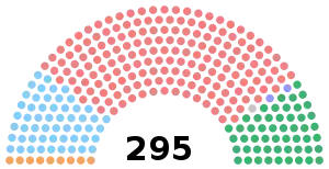| Total sièges : | 32 | 26 | 14 | 14 | 99 | 75 | 10 | 11 | 4 | 7 | 2 | 1 | 295 | ||