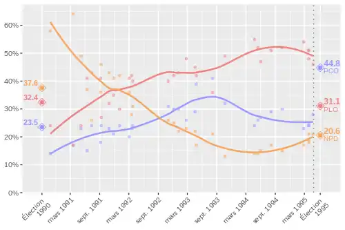 | Élections de 1990 | 23,5 | 32,4 | 37,6 | 6,5 |