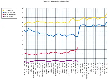 Avec Danilo Astori (Assemblée Uruguay, candidat du Front large à la vice-présidence et ministre de l'Économie du gouvernement Vázquez), José Mujica s'est rendu au Chili et au Brésil pendant la campagne, pour rencontrer respectivement Michelle Bachelet et Lula. Le colistier de Lacalle est Jorge Larrañaga, qui présida le Parti blanco de 2004 à 2008 et fut battu à l'élection présidentielle de 2004 par Tabaré Vázquez.