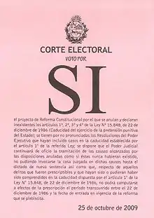 Le second, un référendum d'initiative populaire organisé à l'instigation de la confédération syndicale PIT-CNT, du SERPAJ (Association Paix et Justice), de la FEUU (Fédération des étudiants universitaires d'Uruguay) et du Front large, portait sur l'abrogation de la Loi de Caducité de 1986[10], amnistiant les violations des droits de l'homme commis par les militaires pendant la dictature (1973-1985). Cette proposition fut rejetée, seuls 1 105 768 des Uruguayens (47,98 % des suffrages) ayant voté en sa faveur. Un référendum organisé en 1989 avait aussi échoué à abroger cette amnistie, considérée comme contraire au droit international par la Commission des droits de l'homme des Nations Unies.