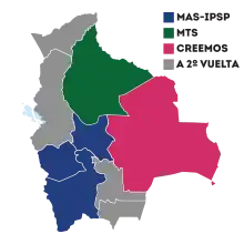 Cependant, la plupart des assemblées législatives départementales demeurent contrôlées par le MAS. Même dans Santa Cruz où la coalition Creemos remporte facilement dès le premier tour, le nombre de membres d'assemblée provenant du MAS égale le nombre de membres de Creemos. Pour constituer le groupe majoritaire de cette assemblée, le MAS conclut un pacte avec les membres des peuples indigènes[65].