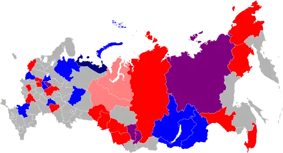 Sur les 21 élections gouvernorales directes, neuf candidats ont obtenu des scores de plus de 80 %, le record étant dans l'oblast de Smolensk avec un score de 86,6 %. Tous les gouverneurs sortants ont été reconduits, dont deux candidats communistes : Andreï Klytchkov (oblast d'Orel), qui bénéficiait du soutien de Russie unie, et Valentin Konovalov (Khakassie). Ce dernier affrontait un candidat de Russie unie. Au mois d'août, quand il est devenu clair dans les sondages que celui-ci n'était pas en mesure de l'emporter, le Kremlin a envisagé divers scénarios, dont l'annulation des résultats. Le candidat de Russie unie s'est finalement retiré une semaine avant le scrutin, en invoquant des raisons de santé[35].