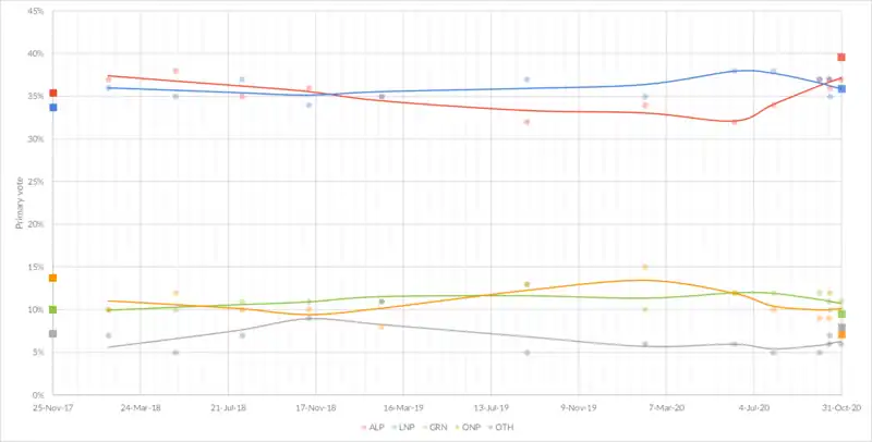 | Newspoll | 34 % | 38 % | 12 % | 11 % | 5 % | 49 % | 51 % | ||