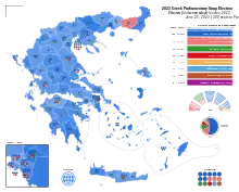 La République hellénique est dotée d'un Parlement monocaméral, également appelé « Voulí », composé de 300 sièges pourvus pour quatre ans selon un mode de scrutin principalement proportionnel auquel peut s'adjoindre une prime majoritaire. Les députés sont ainsi élus au scrutin proportionnel plurinominal avec listes ouvertes et seuil électoral de 3 % dans 59 circonscriptions électorales. L'une d'entre elles, représentant douze sièges, couvre l'ensemble du pays, tandis que les autres le découpent à raison de 1 à 18 sièges par circonscription, en fonction de leurs populations. Parmi celles ci, sept ne comportent ainsi qu'un seul siège. Le mode de scrutin dans ces dernières y est par conséquent de facto uninominal majoritaire à un tour[24],[25].
