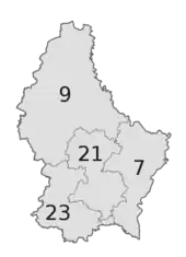 | Diekirch | Diekirch | 22,28 | 16,51 | 8,08 | 32,68 | 2,99 | 7,26 | 6,92 | 2,6 | 0,57 | 0,11 | |||