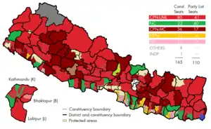 Le Népal est dotée d'un parlement bicaméral, dit Parlement fédéral[9] composé d'une chambre haute, l'Assemblée nationale, composée de 59 membres élus au scrutin indirect pour six ans, renouvelée par tiers tous les deux ans, et d'une chambre basse, la Chambre des représentants, qui se compose de 275 députés élus pour un mandat de cinq ans selon un mode de scrutin parallèle. Sont ainsi à pourvoir 165 sièges au scrutin uninominal majoritaire à un tour dans autant de circonscriptions électorales, auxquels se rajoutent 110 sièges pourvus au scrutin proportionnel plurinominal de liste avec seuil électoral de 3 % dans une unique circonscription nationale[10]. Les électeurs votent ainsi sur deux bulletins de vote séparés. Les députés élus au scrutin majoritaire mais appartenant à un parti ayant échoué à atteindre le seuil électoral sont classifiés au parlement comme indépendants.