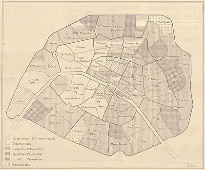 - et des socialistes (11, dont 9 possibilistes et 2 blanquistes)[5], élus dans les quartiers populaires du Nord et du Nord-Est de la capitale[1].