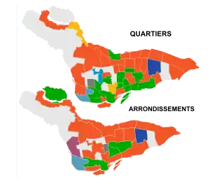 - Il y a 46 postes répartis dans 17 arrondissements, puisque les arrondissements de L'Île-Bizard–Sainte-Geneviève et d'Outremont ne sont représentés au Conseil municipal que par leur maire ou leur mairesse d'arrondissement.