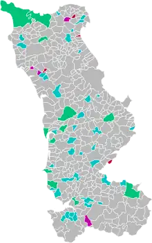 Le premier cas concerne 12 communes comptant plus de 1 000 habitants, un deuxième tour est nécessaire où aucune liste n'a obtenu la majorité absolue