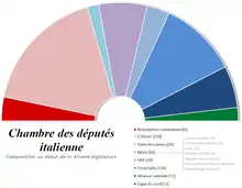 Les sièges sont répartis entre les coalitions ayant obtenu plus de 10 % des suffrages (et dans ces coalitions, parmi les listes ayant obtenu plus de 2 % des suffrages au total, plus celle ayant le plus de voix parmi les listes en dessous de 2 %), ainsi qu'entre les listes indépendantes ayant obtenu 4 % ou plus. La coalition ou la liste arrivée en tête obtient au minimum 55 % des sièges (340 parmi les 617), plus des sièges supplémentaires en fonction de l'avance sur l'autre parti ou coalition. À ces 617 députés s'ajoutent 12 députés élus par les Italiens résidant à l'étranger, et un élu par le Val d'Aoste.