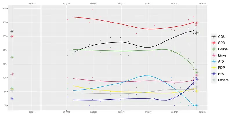 | Infratest dimap | 01/03/2023 | 27 % | 28 % | 19 % | 4 % | 8 % | 7 % | – |