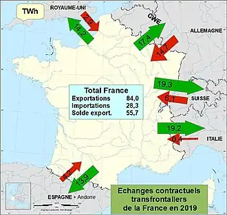 La France est en 2023 le premier pays exportateur d’Europe, par son solde exportateur de 50,1 TWh. En 2019, elle était le premier pays exportateur au monde, effectuant 17,3 % des exportations mondiales mais avait perdu cette place en 2022, devenant importatrice nette (solde importateur : 16,5 TWh).