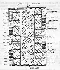 Le principe de la diffusion de gaz est illustré dans ce schéma. La couche dite de distribution de gaz est située au milieu de l'électrode. Avec seulement une petite pression de gaz, l'électrolyte est déplacé de ce système de pores. Une petite résistance à l'écoulement garantit que le gaz peut circuler librement à l'intérieur de l'électrode. À une pression de gaz légèrement plus élevée, l'électrolyte dans le système de pores est limité à la couche de travail. La couche de surface elle-même a des pores si fins que, même lorsque les pics de pression, le gaz ne peut pas traverser l'électrode dans l'électrolyte. Ces électrodes ont été produites par diffusion et par frittage ou compression à chaud. Pour produire des électrodes multicouches, un matériau à grain fin a été dispersé dans un moule et lissé. Ensuite, les autres matériaux ont été appliqués en plusieurs couches et mis sous pression. La production était non seulement sujette aux erreurs mais aussi longue et difficile à automatiser.