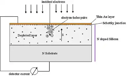 Un des détecteurs d'électrons rétrodiffusés est une simple jonction, généralement une jonction Schottky. On parle souvent de détecteur à l'état solide. Il fonctionne sur le principe de la génération de paires électron-trou induite dans les matériaux semi-conducteurs par un électron incident doté d'une certaine énergie. Si la paire électron-trou est créée dans la zone déserte d'une jonction, les électrons libres et les trous se déplacent dans des directions opposées, de telle sorte que la charge collectée sur l'électrode externe peut être injectée à l'entrée d'un amplificateur de courant. Le gain interne de cette diode est typiquement de 2 500 pour des électrons incidents de 10 keV[2].