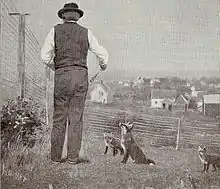 Nourrissage de renards argentés captifs à Foxcroft, au Maine, aux États-Unis. Photographie de Paul Larisch (de) prise autour de 1901.