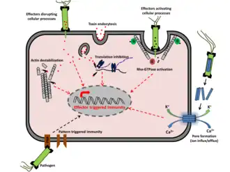 Face à la reconnaissance d'éliciteurs intracellulaires (effecteurs ou facteurs de virulence introduits par le pathogène au sein même de la cellule végétale), la plante met en place un système défensif différé appelé « gène pour gène » (à chaque gène d'avirulence du pathogène codant une protéine se comportant comme un facteur de virulence, correspond une protéine de résistance codée par un gène de résistance de la plante). Un effecteur peut agir de deux façons sur la plante. Soit il induit la production de molécules activant une voie de défense, antagoniste de celle efficace contre le pathogène, soit il arrête la production d'une molécule de défense de la plante. À son tour, la plante développe une résistance spécifique qui amplifie et accélère la première défense. Cette résistance systémique acquise implique des voies de signalisation cellulaire induites par ces éliciteurs, aboutissant à l'induction transcriptionnelle d'une multitude de gènes défensifs souvent communs au règne animal et végétal. Cette résistance s'accompagne le plus souvent d'une mort des cellules végétales par apoptose ou nécrose au niveau du site d'infection : c'est la réponse hypersensible[10].