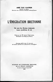 - André Meynier, « L'émigration bretonne vue par l'abbé Elie Gautier », Annales de Bretagne, t. 59, no 1, , p. 137-140 (DOI 10.3406/abpo.1952.4418, lire en ligne, consulté le ).
