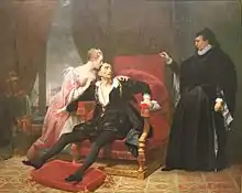 La mort de Charles IX (XIXe siècle) Le roi Charles IX sentant la mort approcher hésite à remettre l'acte de régence à sa mère Catherine de Médicis qu'il tient dans sa main. Il est réconforté par son épouse Élisabeth d'Autriche alors qu'il pointe du doigt la fenêtre du Louvre[6]. Tableau de Raymond Quinsac Monvoisin[7].